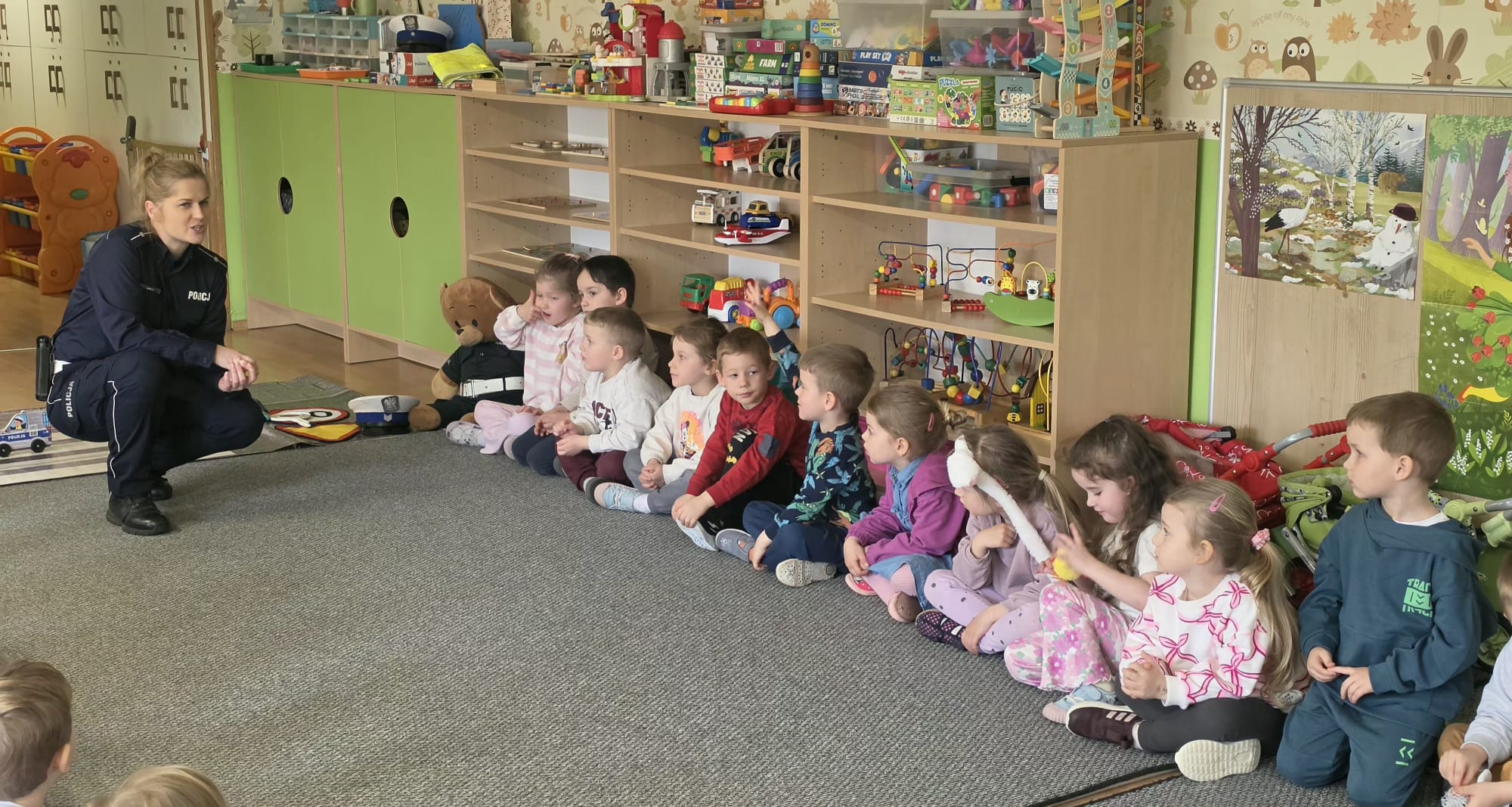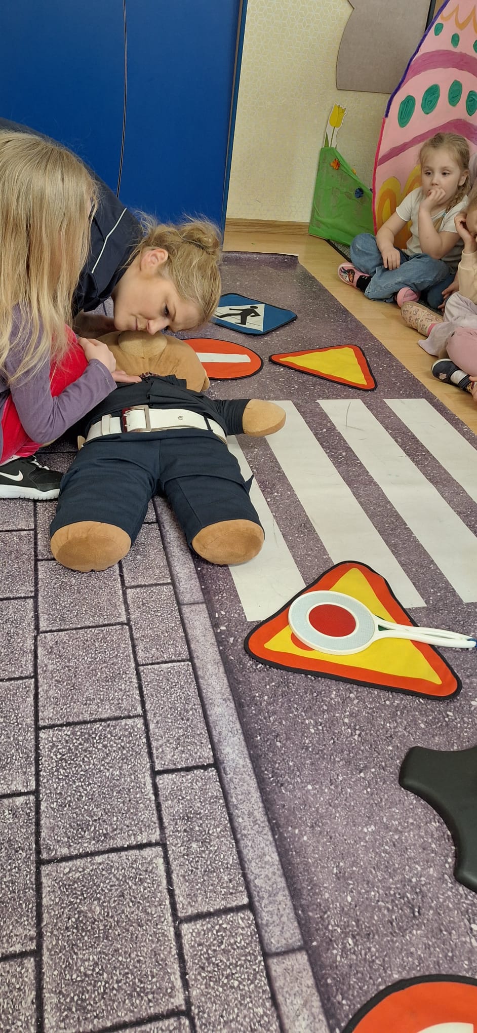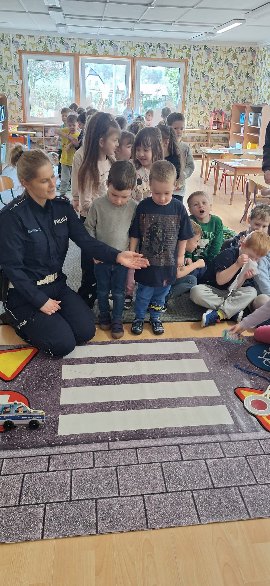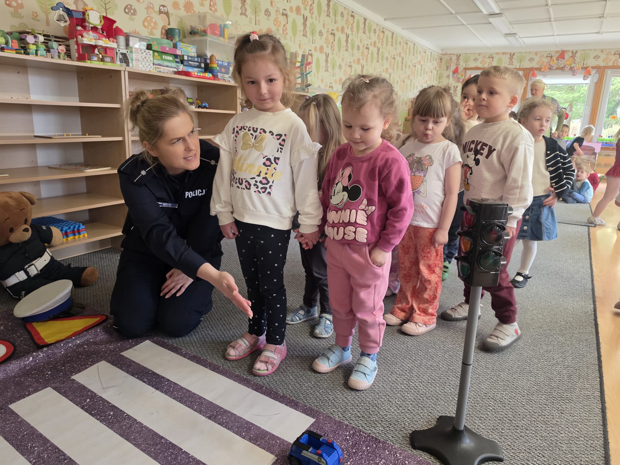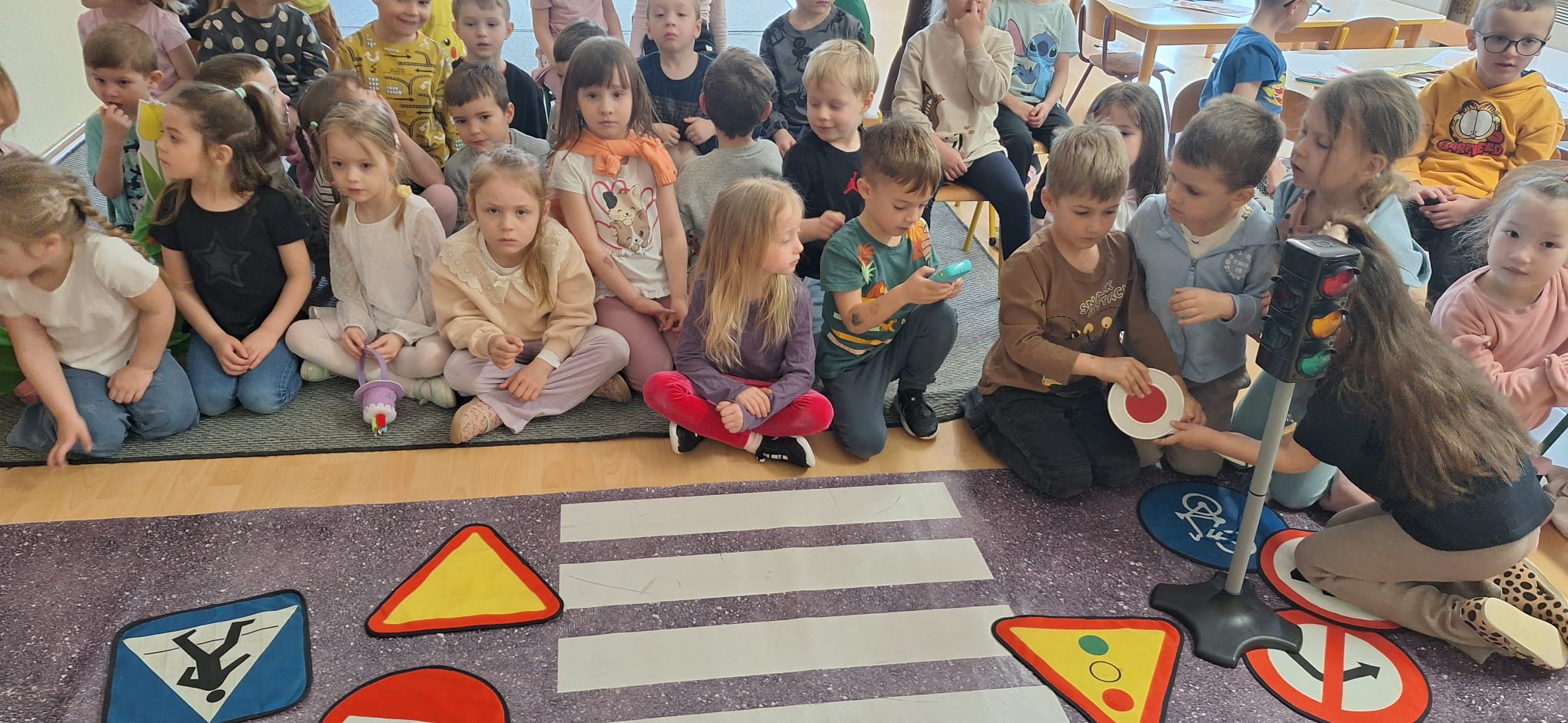 Zasady bepieczeństwa na drodze przypomniała nam pani Policjantka. Utrwaliliśmy znaczenie sygnalizacji świetlnej oraz jak bezpiecznie poruszać się po ulicy. Aktywnie uczestniczyliśmy w spotkaniu i utrwaliliśmy naszą wiedzę.